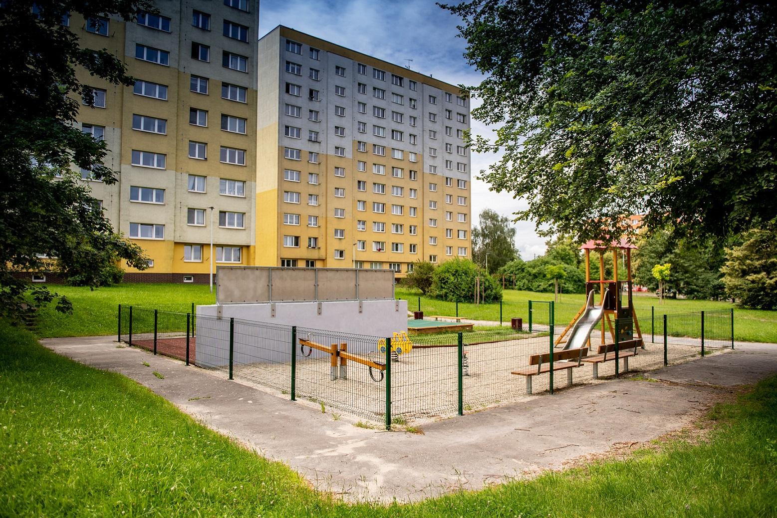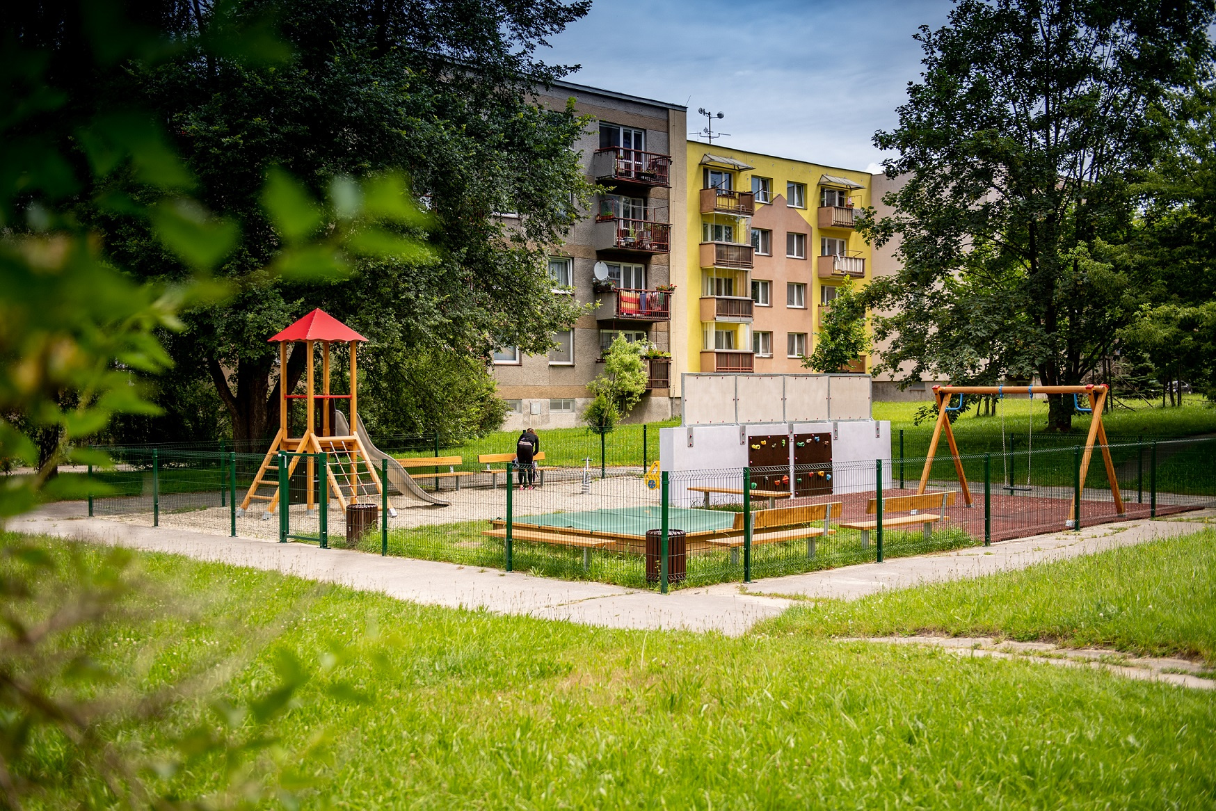 Bezpečné a moderní hřiště s herními prvky — skluzavkami, houpačkami, průlezkami a malou lezeckou stěnou. Hřiště je navrženo tak, aby dětem poskytovalo prostor pro volnou hru, pohyb i rozvoj dovedností v bezpečném a přívětivém prostředí.