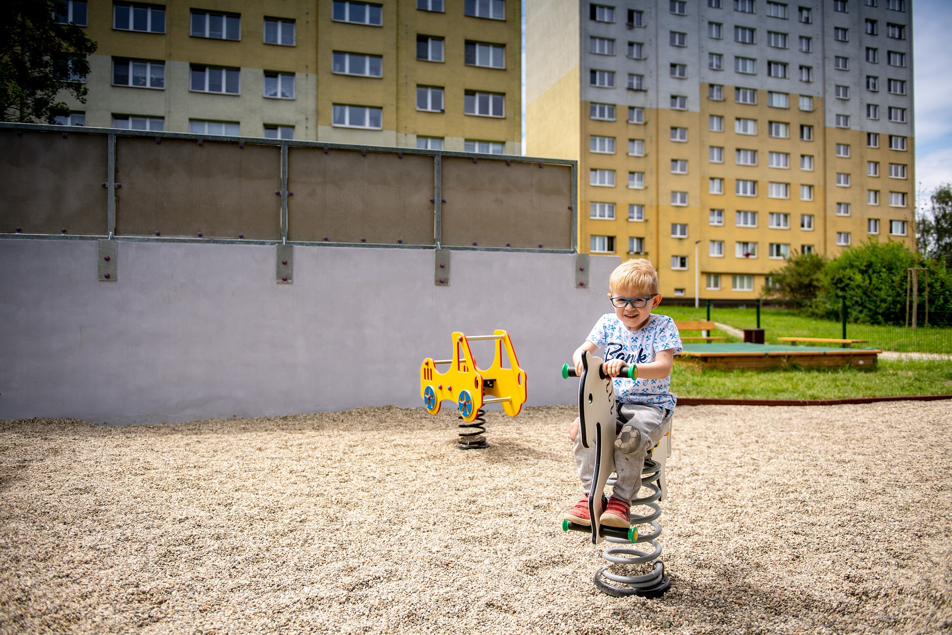 Bezpečné a moderní hřiště s herními prvky — skluzavkami, houpačkami, průlezkami a malou lezeckou stěnou. Hřiště je navrženo tak, aby dětem poskytovalo prostor pro volnou hru, pohyb i rozvoj dovedností v bezpečném a přívětivém prostředí.