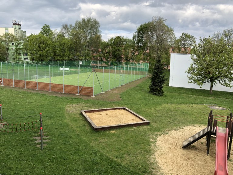 Na zahradě školy je momentálně přístupné pouze víceúčelové hřiště a pár dětských herních prvků, které se nacházejí v jeho blízkém okolí.